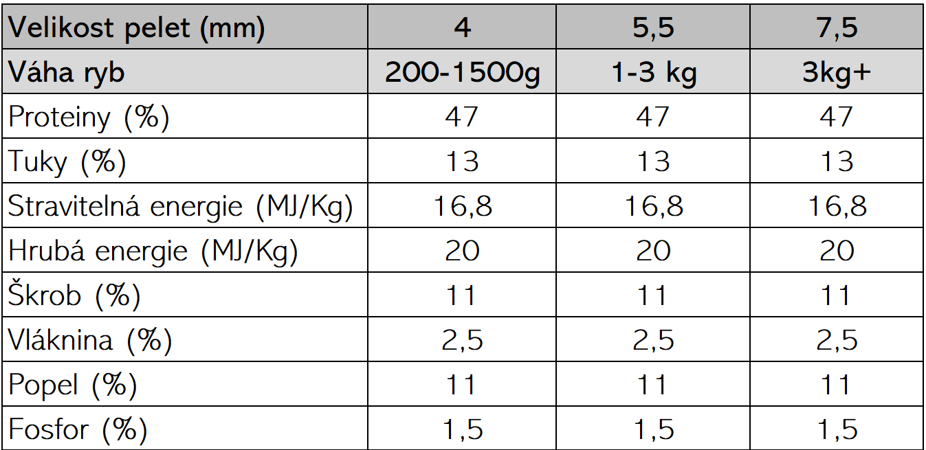 Vysoká stravitelnost proteinů: Obsahuje vysoce stravitelné mořské a rostlinné bílkoviny, které podporují efektivní růst a zdraví jeseterů.